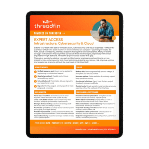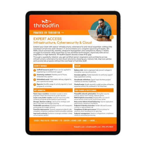 Extend your team with senior infrastructure, cybersecurity and cloud expertise—without the overhead of full-time staff. Modern IT environments are complex—spanning firewalls, SD-WAN, cloud connectivity, identity, endpoint managemen and compliance. Many IT teams struggle to maintain deep expertise across all these technologies, especially with senior engineers in high demand. Threadfin Expert Access closes that gap.